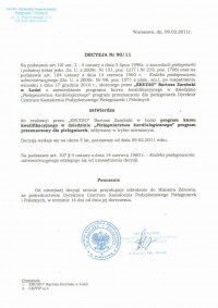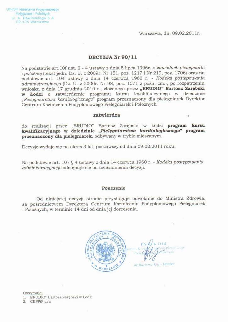 ERUDIO - Centrum Kształcenia Ustawicznego w Łodzi realizuje Kurs kwalifikacyjny w dziedzinie Pielęgniarstwa kardiologicznego dla pielęgniarek na podstawie DECYZJI Nr 90/11 (kliknij w obrazek, aby powiększyć w nowym oknie):