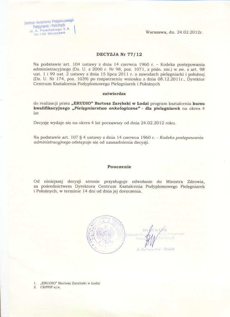 ERUDIO - Centrum Kształcenia Ustawicznego w Łodzi realizuje Kurs kwalifikacyjny w dziedzinie Pielęgniarstwa onkologicznego dla pielęgniarek na podstawie DECYZJI Nr 77/12 (kliknij w obrazek, aby powiększyć w nowym oknie):