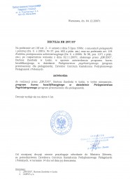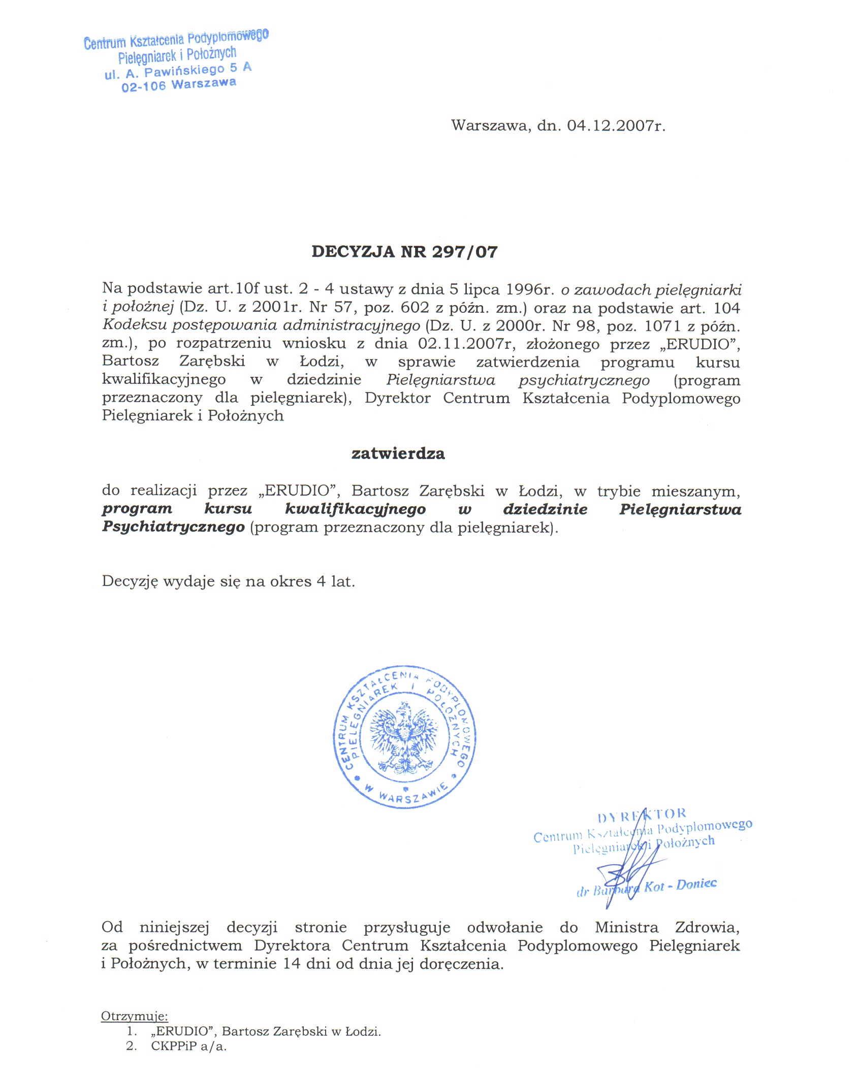 ERUDIO - Centrum Kształcenia Ustawicznego w Łodzi realizuje Kurs kwalifikacyjny w dziedzinie Pielęgniarstwa psychiatrycznego dla pielęgniarek na podstawie DECYZJI Nr 297/07 (kliknij w obrazek, aby powiększyć w nowym oknie):