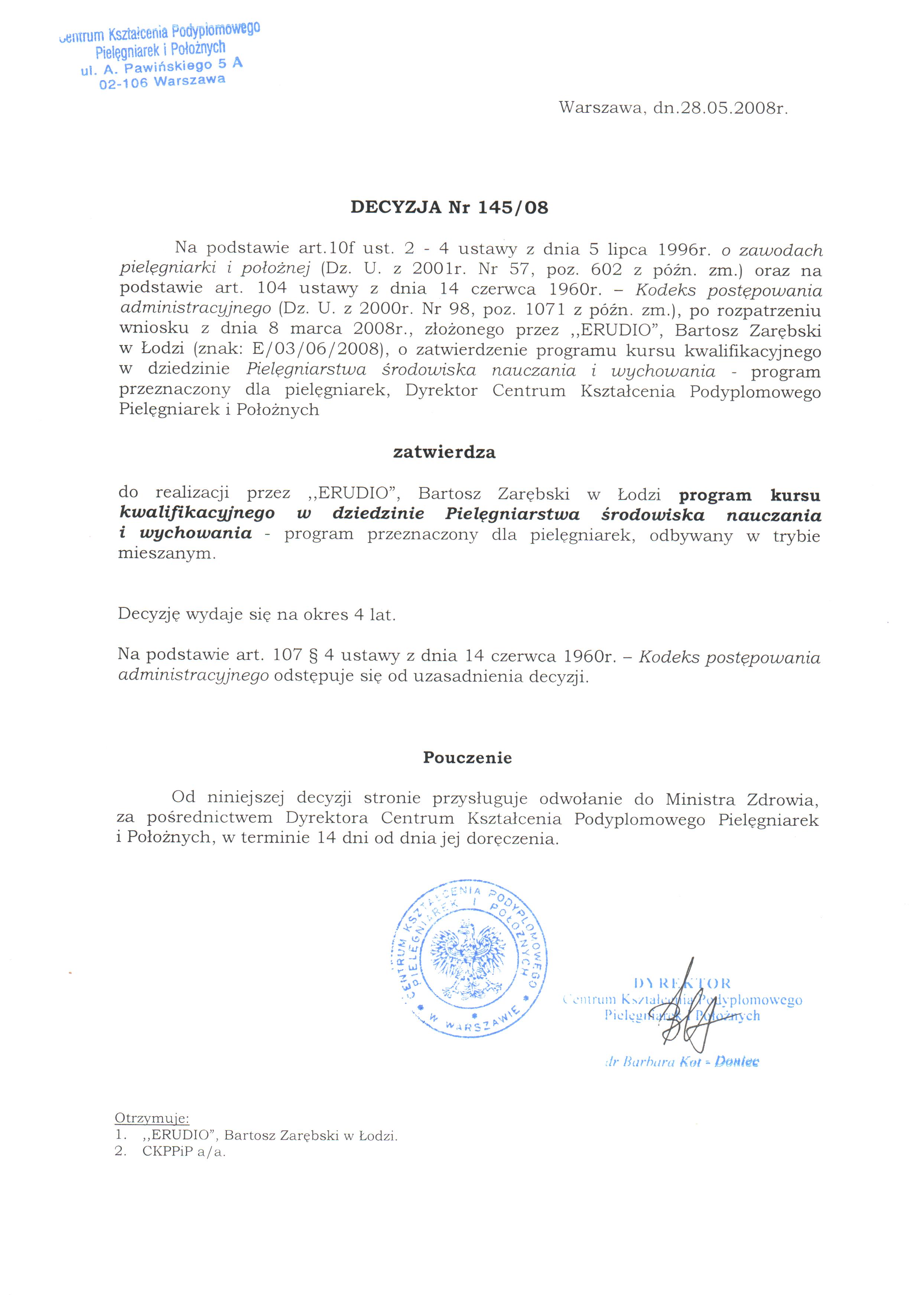 ERUDIO - Centrum Kształcenia Ustawicznego w Łodzi realizuje Kurs kwalifikacyjny w dziedzinie Pielęgniarstwa środowiska nauczania i wychowania dla pielęgniarek na podstawie DECYZJI Nr 145/08 (kliknij w obrazek, aby powiększyć w nowym oknie):