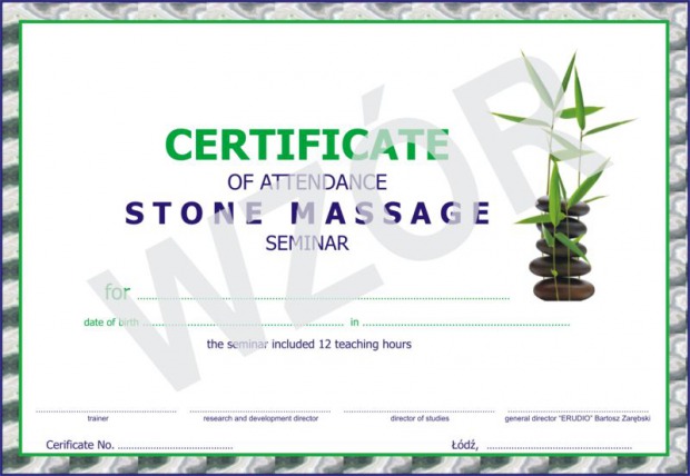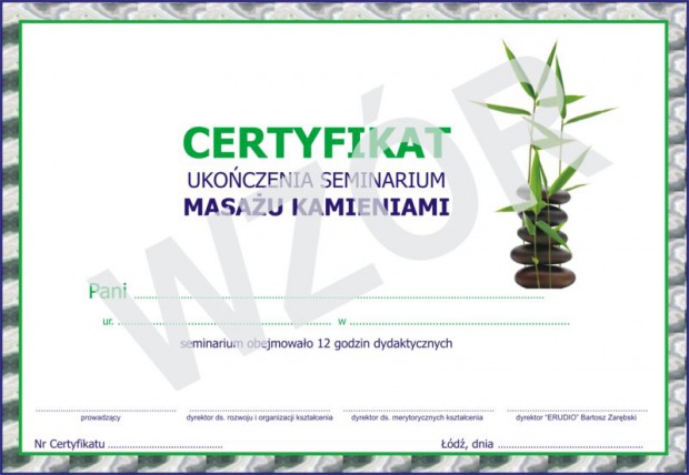 Na podstawie egzaminu wydawane jest Zaświadczenie ukończenia Kursu Masażu kamieniami (dokumenty wydawane są na mocy Rozporządzenia Ministra Edukacji i Nauki z dnia 3 lutego 2006 r. w sprawie uzyskiwania i uzupełniania przez osoby dorosłe wiedzy ogólnej, umiejętności i kwalifikacji zawodowych w formach pozaszkolnych), uprawniające do samodzielnego wykonywania zabiegów z zakresu zagadnień objętych kursem.