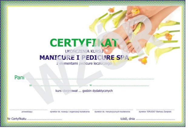 Na podstawie egzaminu wydawane jest Zaświadczenie ukończenia Kursu Manicure, pedicure z zabiegami SPA (dokumenty wydawane są na mocy Rozporządzenia Ministra Edukacji i Nauki z dnia 3 lutego 2006 r. w sprawie uzyskiwania i uzupełniania przez osoby dorosłe wiedzy ogólnej, umiejętności i kwalifikacji zawodowych w formach pozaszkolnych), uprawniające do samodzielnego wykonywania zabiegów z zakresu zagadnień objętych kursem.