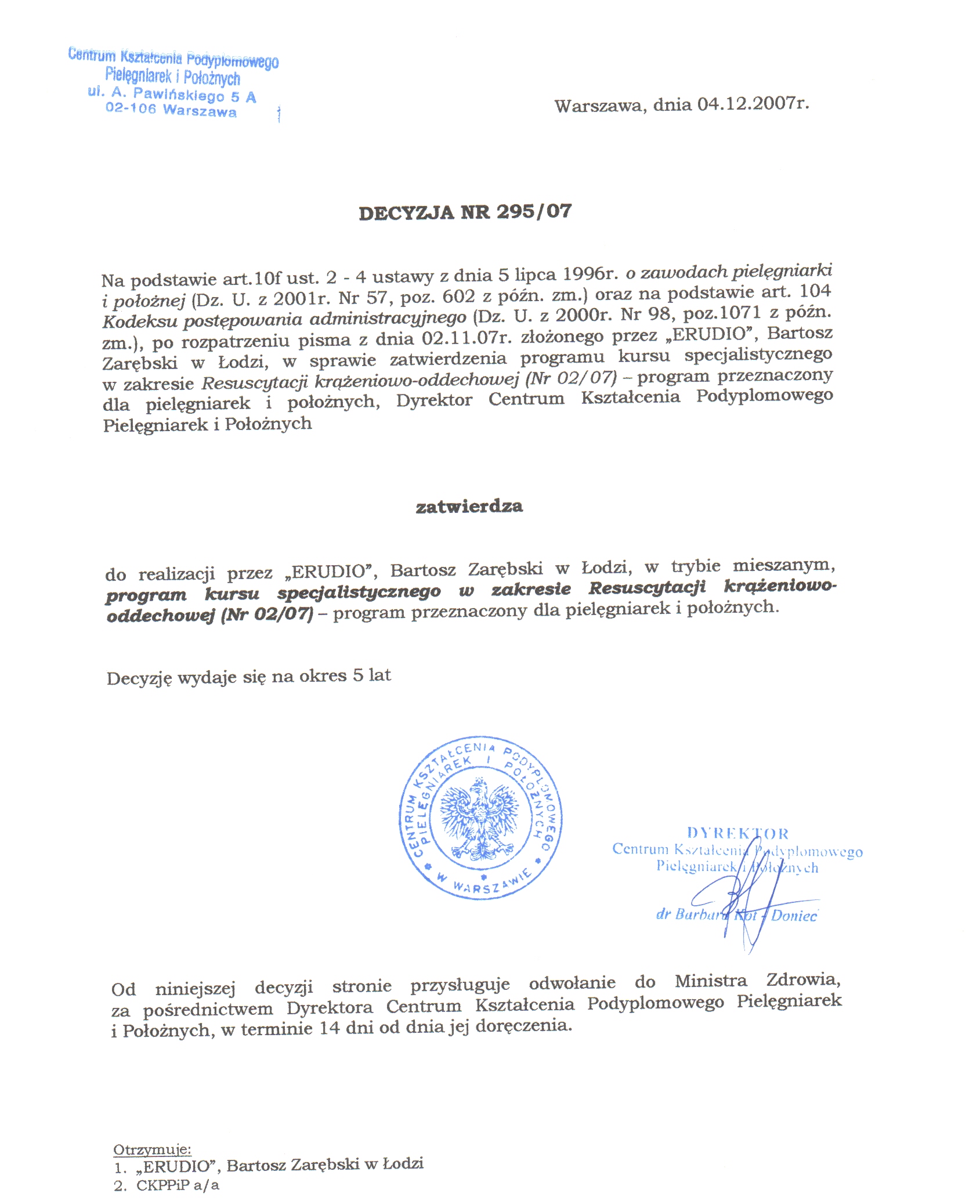 ERUDIO - Centrum Kształcenia Ustawicznego w Łodzi realizuje Kurs specjalistyczny w zakresie Resuscytacji krążeniowo - oddechowej dla pielęgniarek i położnych, na podstawie DECYZJI Nr 295/07 (kliknij w obrazek, aby powiększyć w nowym oknie):