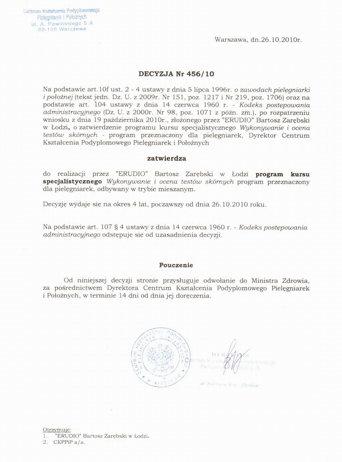 ERUDIO - Centrum Kształcenia Ustawicznego w Łodzi realizuje Kurs specjalistyczny w zakresie Wykonywanie i ocena testów skórnych dla pielęgniarek na podstawie DECYZJI Nr 456/10 (kliknij w obrazek, aby powiększyć w nowym oknie):