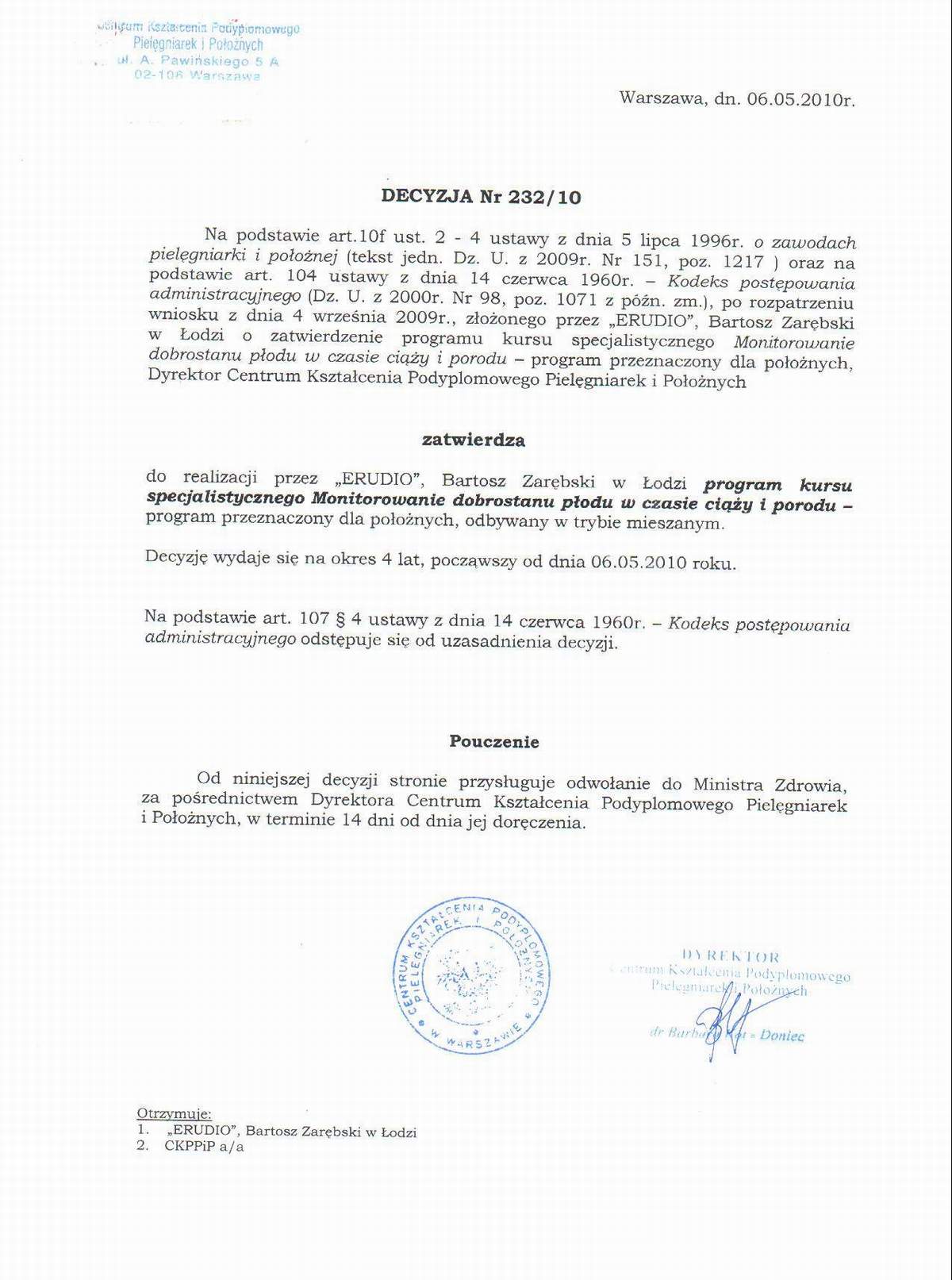 ERUDIO - Centrum Kształcenia Ustawicznego w Łodzi realizuje Kurs specjalistyczny w zakresie Monitorowanie dobrostanu płodu w czasie ciąży i porodu na podstawie DECYZJI Nr 232/10 (kliknij w obrazek, aby powiększyć w nowym oknie):