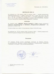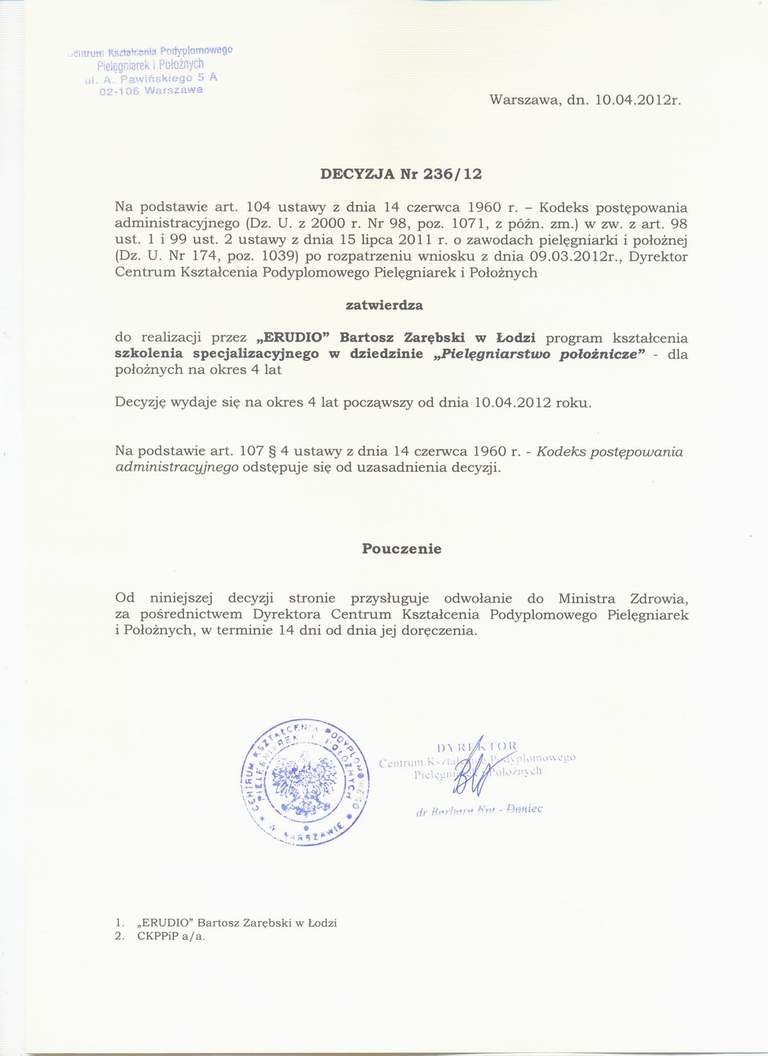 Centrum Edukacji ERUDIO w Łodzi realizuje Szkolenie specjalizacyjne w dziedzinie Pielęgniarstwa położniczego dla pielęgniarek na podstawie DECYZJI Nr 236/12 (kliknij w obrazek, aby powiększyć w nowym oknie):